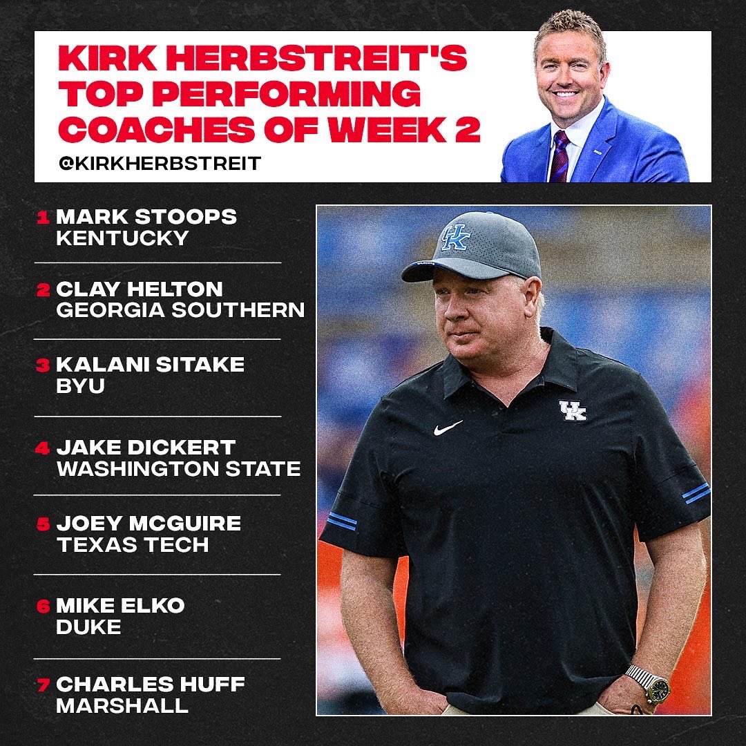 Kirk Herbstreit On Twitter Here Are My Top Performing Coaches From Week 2 1 Mark Stoops Ukfootball 2 Clay Helton Gsathletics Fb 3 Kalani Sitake Byufootball 4 Jake Dickert Wsucougarfb 5 Joey